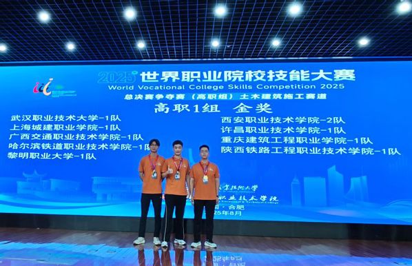(通讯员 武敬)8月31日,世界职业院校技能大赛总决赛争夺赛土木建筑施工赛道(高职组)在安徽合肥落下帷幕。来自全国28个省(自治区、直辖市)的154支代表队、600余名选手同台竞技。经过激烈比拼,武汉职业技术大学代表队成功登顶——由建筑工程学院教师赵亮领队,江俐敏、王冰担任指导教师,建筑工程技术专业学生周想、顿道坤、李俊华组成的参赛团队,凭借前瞻性的课题设计、扎实的专业功底与出色的现场表现荣获全国金奖。