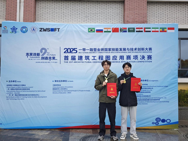新闻网讯(通讯员武敬)11月9日,2025“一带一路”暨金砖国家技能发展与技术创新大赛之首届建筑工程图应用赛项在贵州航天职业技术学院落下帷幕。由专业教师赵亮、祝叶、王冰、江俐敏共同指导,造价23302班张宜、建工23304班顿道坤组成的武汉职业技术大学参赛团队,与全国98所院校122支队伍同台竞技,最终以高校组第二名的优异成绩荣获一等奖,成功晋级北非国际赛;赵亮、祝叶获评“优秀指导教师”;学校荣膺“最佳组织奖”。