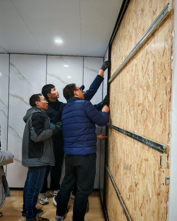 实训区的装配式装修工位前,激光水平仪的绿线在墙面上划开,老师们开始了墙板拼接实训。有人举着水平仪校准龙骨轨道的水平度,有人扶着OSB墙板对准轨道卡槽,还有人用专用卡扣固定墙板拼接缝。“看这条绿线,轨道差1毫米,墙板就会翘边!”万煜老师指着水平仪提示,夏莲老师立刻掏出手机拍下“水平仪+龙骨”的校准画面:“以前讲装配式装修只说‘干法施工快’,今天亲手把墙板卡进轨道,才懂‘精度是快装的前提’——新学期让学生分组装这面墙,看看哪组更精准。”